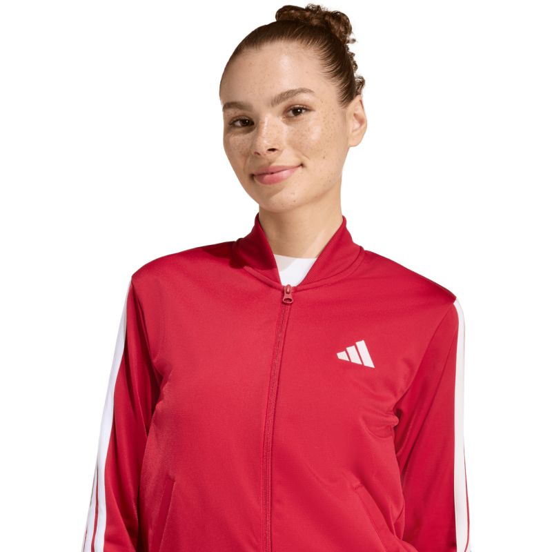 Dres damski adidas Dayready czerwony KB8158 Damski dres adidas zadba o najlepszy komfort podczas sportowych aktywności i w chwilach błogiego odpoczynku. Szybkoschnący materiał z włókien powstałych w procesie recyklingu. Dane techniczne:· Materiał: 100% poliester z recyklingu· Standardowy krój ze średnio zabudowaną talią· Suwak na całej długości i stawiany kołnierz· Przednie kieszenie w spodniach i w bluzie· Mankiety i dół ze ściągaczami· Elastyczna talia ze sznurkiem