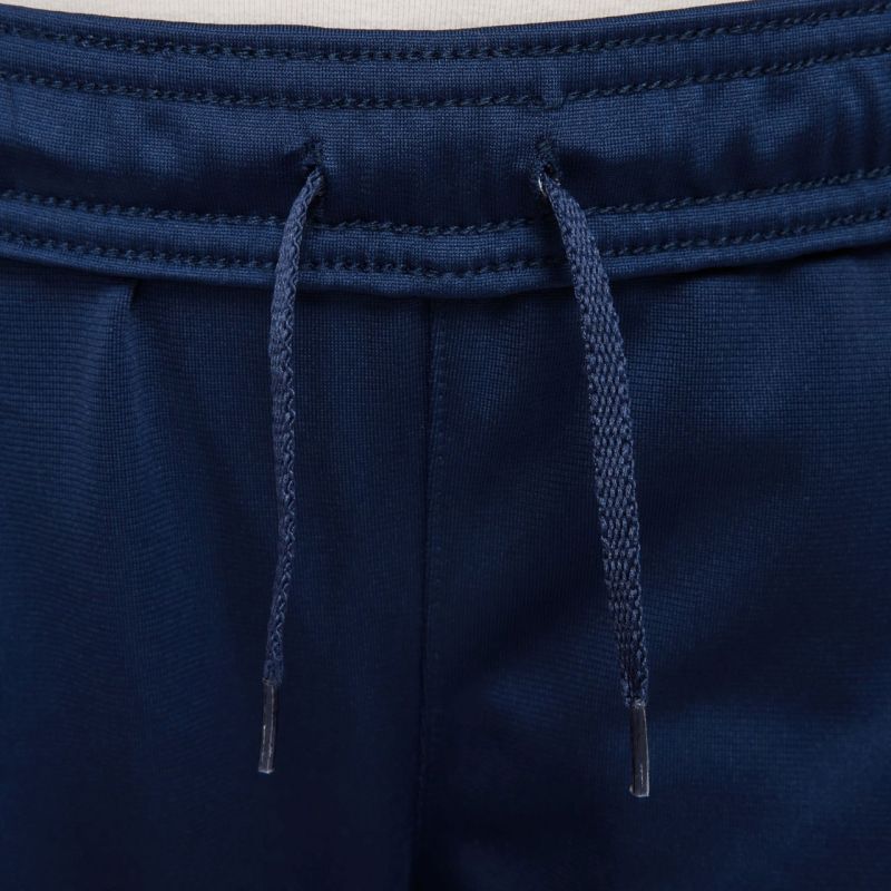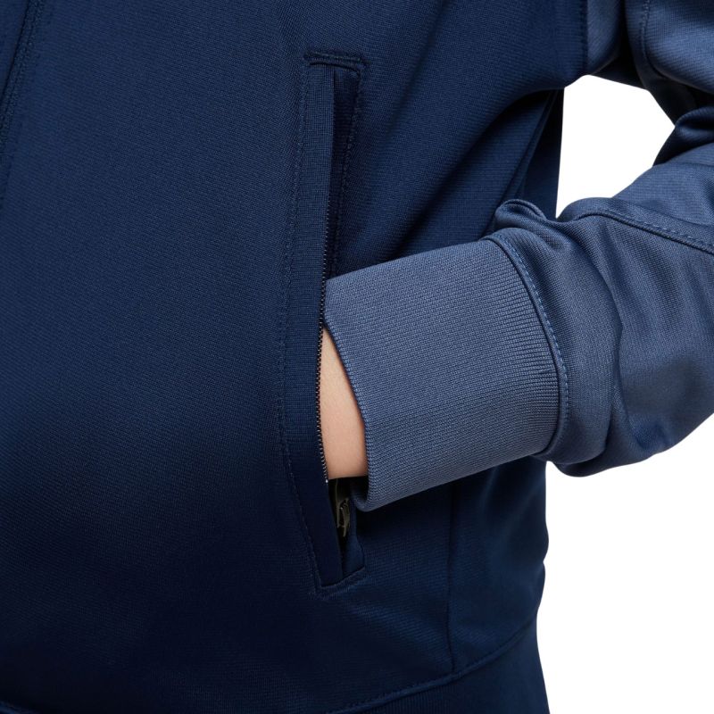 Dres dla dzieci Nike PSG Strike granatowy HJ8032 411 Dres to funkcjonalny dodatek w sportowej garderobie młodych kibiców. Logo Paris Saint-Germain. Technologia Dri-FIT ma zadanie odprowadzenie wilgoci. Bluza posiada zamek na całej długości i kieszenie. Spodnie dresowe zakończono ściągaczami. Elastyczna talia regulowana sznurkiem. Materiał: 100% poliester