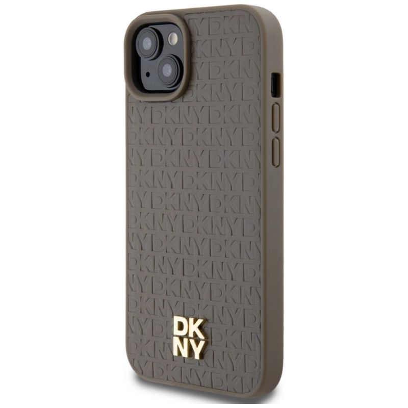Etui DKNY Leather Pattern Metal Logo MagSafe na iPhone 15 Plus / 14 Plus - brązowe