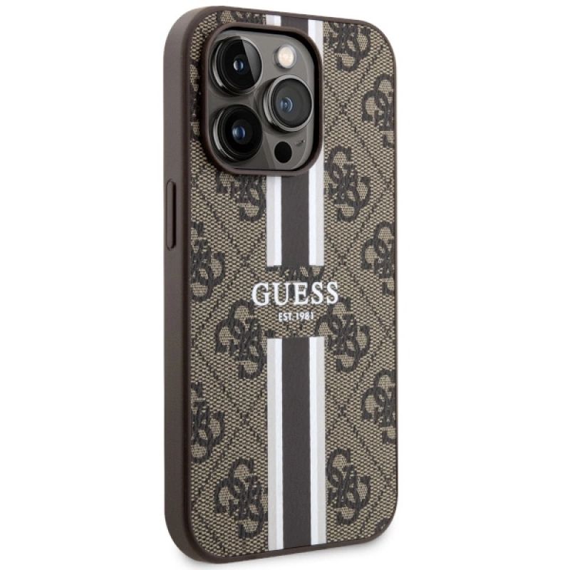 Etui Guess 4G Printed Stripes MagSafe na iPhone 14 Pro - brązowe