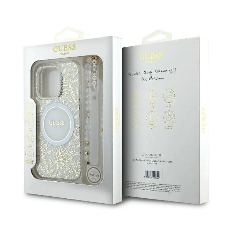 Ta elegancka kolekcja zachwyci nawet najbardziej wybredne i wyrafinowane gusta. Wierzchnia warstwa pokrowca zachwyca subtelnym, złotym, roślinnym wzorem, który nadaje mu elegancji i klasy. Centralnym punktem etui jest złoty pierścień MagSafe, otaczający stylowe logo GUESS, które dodaje prestiżu i podkreśla wyjątkowy design. Całość uzupełnia gustowny koralikowy brelok, doskonale współgrający z kolorystyką pokrowca, z literkami tworzącymi nazwę „GUESS”, co sprawia, że akcesorium to jest nie tylko praktyczne, ale i wyjątkowo modne.