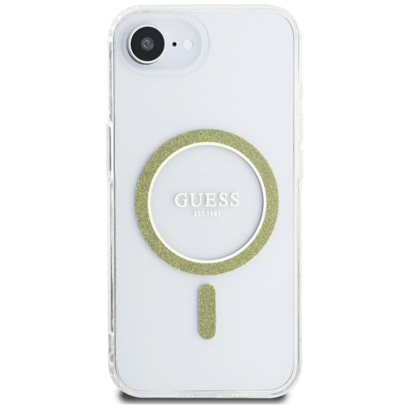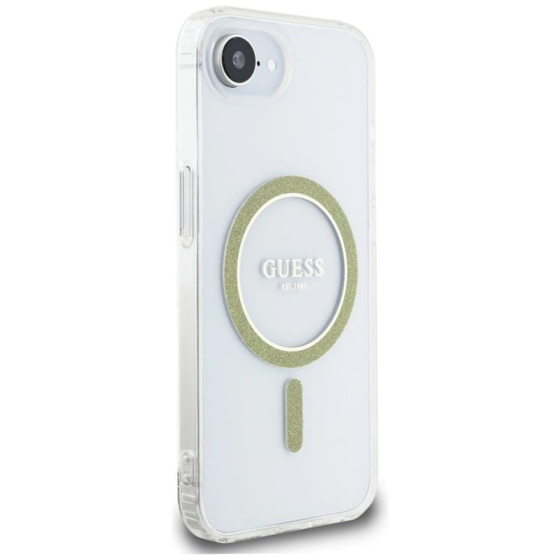 Etui Guess IML Glitter Circle MagSafe na iPhone 16e - przezroczyste
