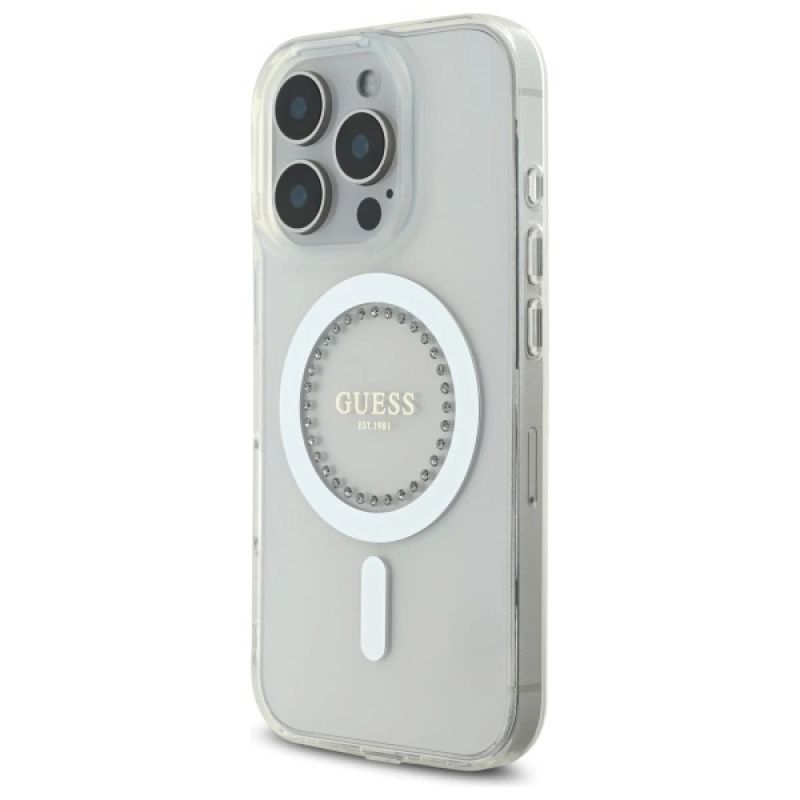 Etui Guess IML Rhinestones MagSafe na iPhone 16 Pro - białe