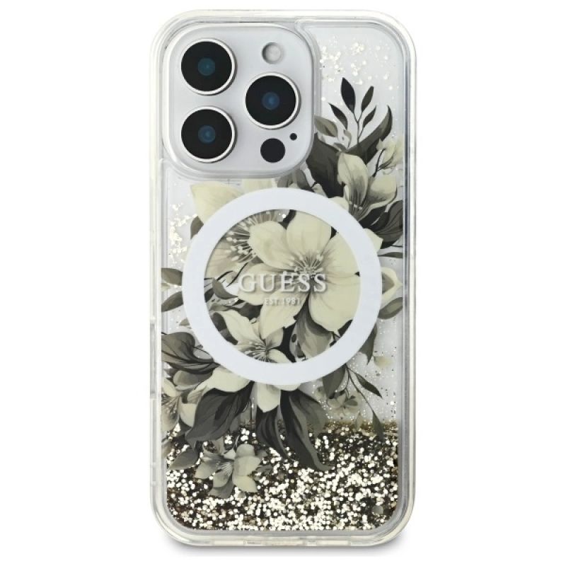 Etui Guess Liquid Glitter Flower MagSafe na iPhone 16 Pro - beżowe