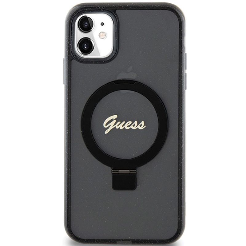 Etui Guess Ring Stand Script Glitter MagSafe na iPhone 11 / Xr - czarne