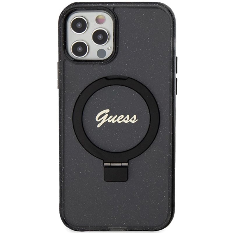 Etui Guess Ring Stand Script Glitter MagSafe na iPhone 12/12 Pro - czarne