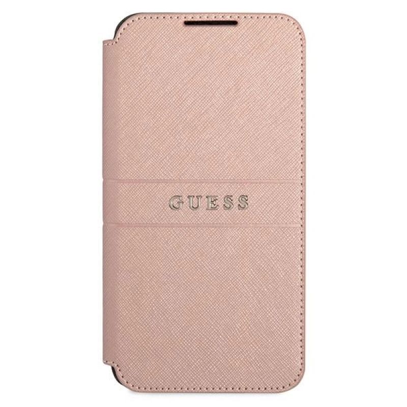 Szykowne etui Guess z kolekcji Saffiano charakteryzuje elegancką, skórą saffiano, ozdobioną złotym logo Guess.