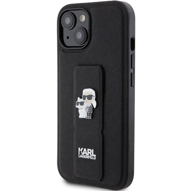 Etui Karl Lagerfeld Gripstand Saffiano Karl&Choupette Pins na iPhone 15 - czarne