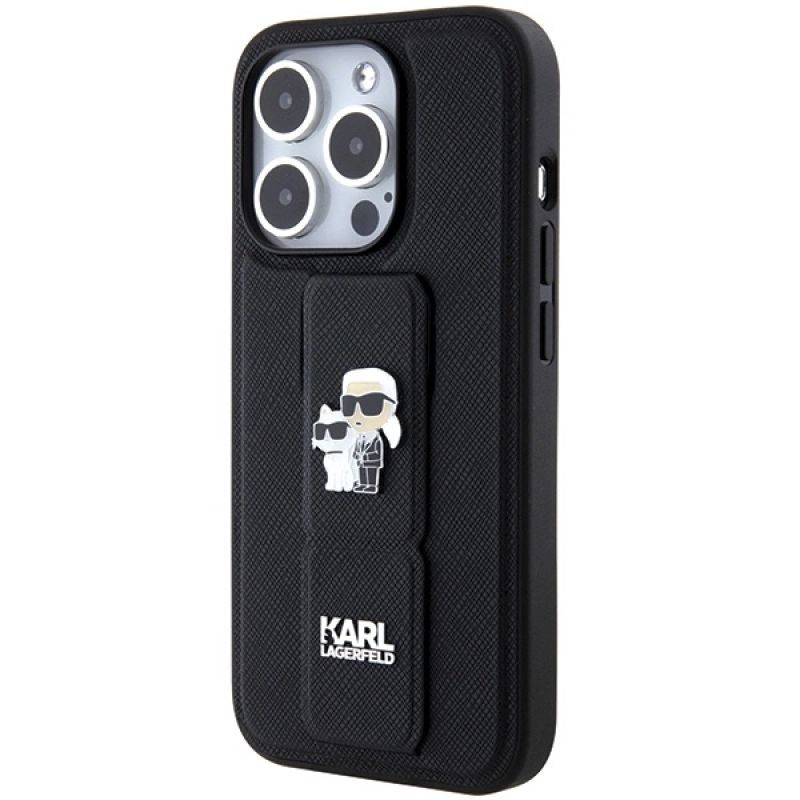Etui Karl Lagerfeld Gripstand Saffiano Karl&Choupette Pins na iPhone 15 Pro - czarne