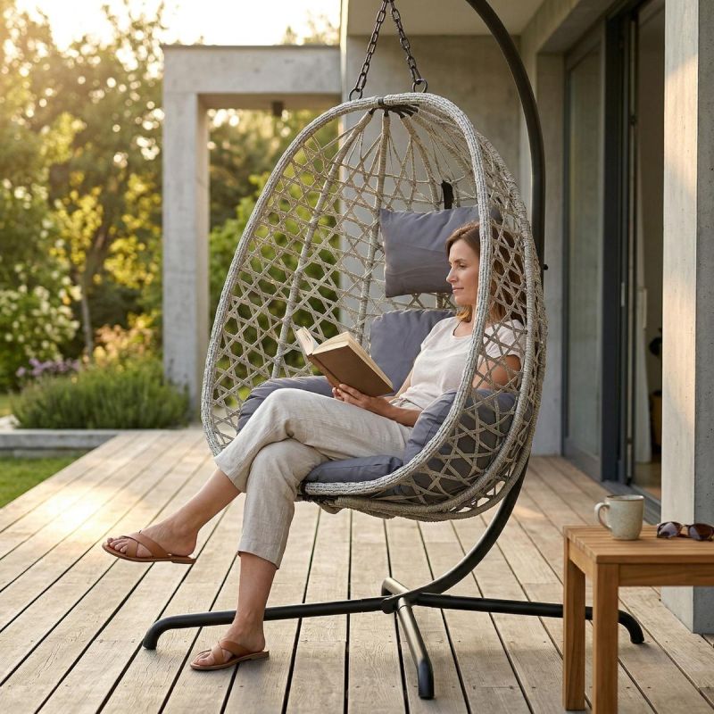 FOTEL WISZĄCY KOKON ZE STELAŻEM 195CM CIEMNO BRĄZOWY 120KG to połączenie funkcjonalności i modnego designu. Dzięki własnej, stabilnej podstawie (100x100x196 cm) nie wymaga montażu do sufitu ani belki. Sprawdzi się w ogrodzie, na tarasie, balkonie, a nawet w salonie, tworząc komfortowe miejsce do czytania, relaksu czy odpoczynku.