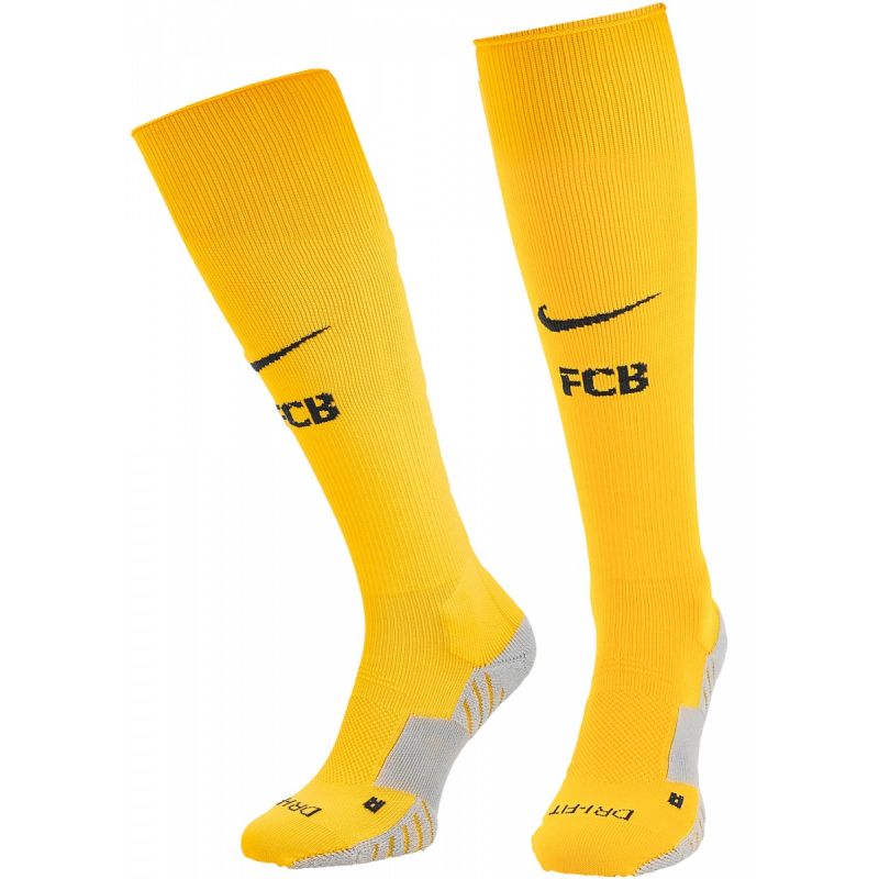 Getry uszyte są z materiału Dri-FIT który odprowadza pot z powierzchni ciała na zewnątrz, pozostawiając stopy suche, dzięki czemu dłużej zachowują świeżość. Elastyczny materiał gwarantuje idealne dopasowanie, natomiast część środkowa zapewnia dodatkowe wsparcie. Ponadto profilowane są na lewą i prawą nogę, co sprawia, że nawet po dłuższym użytkowaniu w okolicy palców nie zbiera się zbędny materiał. Na getrach dominuje kolor żółty, taki w którym występuje bramkarz Barcy, a na frontowej części widnieje znaczek Nike oraz skrót nazwy katalońskiej drużyny FCB.