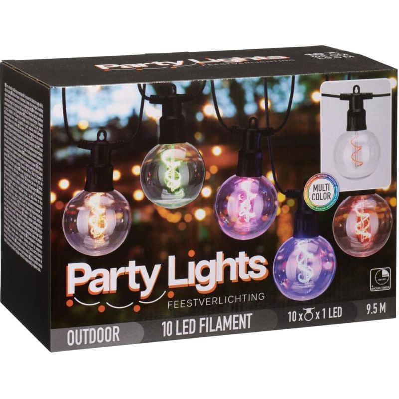 GIRLANDA OGRODOWA PARTY LIGHT 10 LED G80 MULTIKOLOR Z TIMEREM – 9,5 m to idealne rozwiązanie dla każdego, kto chce stworzyć wyjątkowy klimat na zewnątrz! Kolorowe żarówki G80 w połączeniu z funkcją timera zapewniają nie tylko efektowny wygląd, ale też wygodę użytkowania – bez potrzeby codziennego włączania i wyłączania.