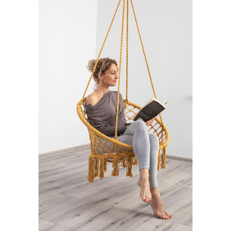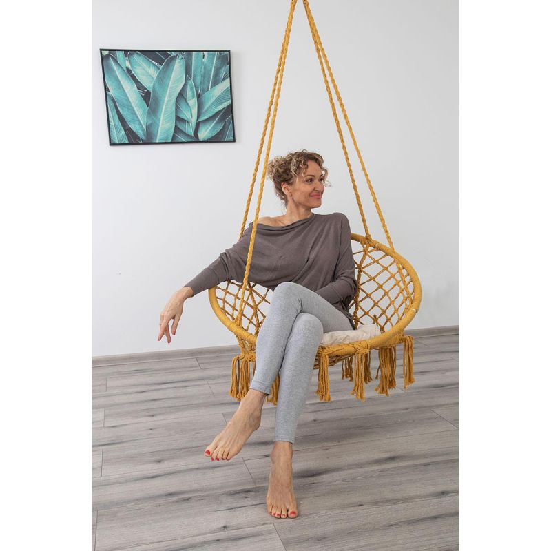 HAMAK AŻUROWY FOTEL WISZĄCY Z PODUSZKĄ MIODOWY będzie Twoim, ulubionym miejscem relaksu w domu, w ogrodzie, na tarasie lub na balkonie. Stwórz z jego pomocą swoją prywatną oazą spokoju.