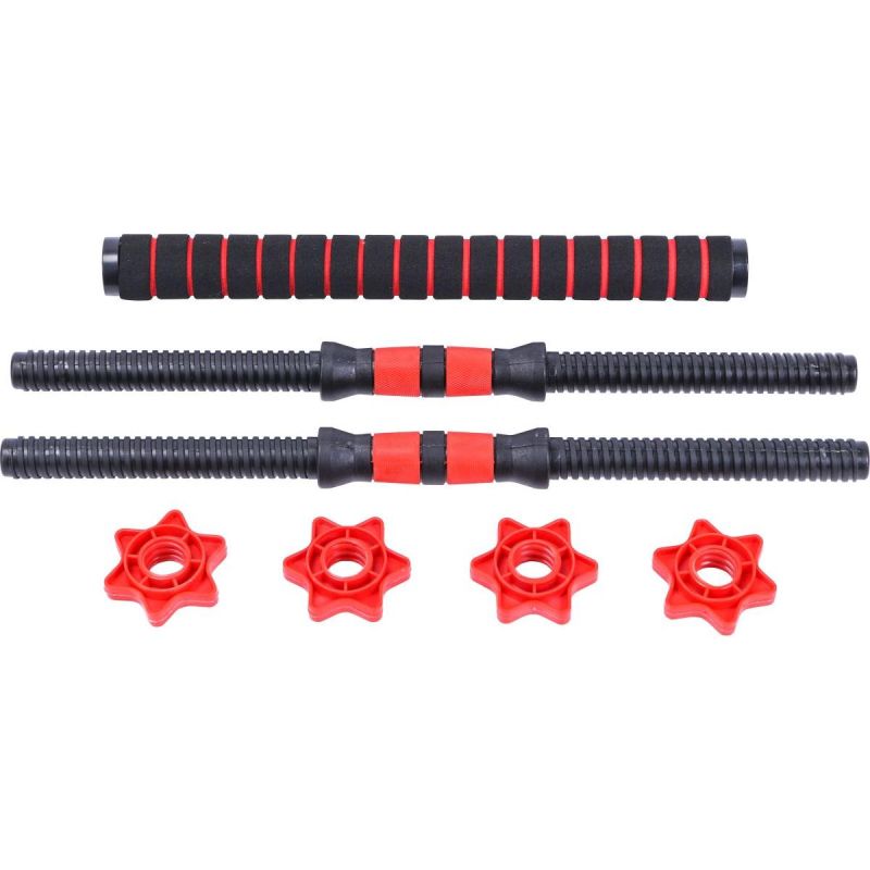 - Skład zestawu: 16 obciążeń o wadze 2,5 kg, dwa łączniki (56 cm i 40 cm), dwa gryfy do hantli (50,5cm), zaciski (nakrętki) - 4 szt.