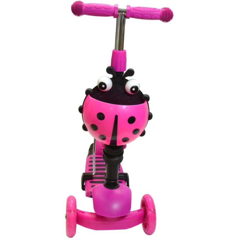 Koszyczek – biedronka przyczepiana do sztycy jeździka pozwoli dziecku na schowanie swoich skarbów lub małej przekąski, a regulowane, zdejmowane siodełko wyściełane miękką powłoką, wygodnie usiąść.