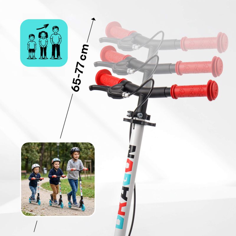 Regulowana wysokość kierownicy - dzięki trójstopniowej regulacji wysokości kierownicy, hulajnoga Meteor Dragon rośnie razem z Twoim dzieckiem, zapewniając idealne dopasowanie i ergonomiczną jazdę.