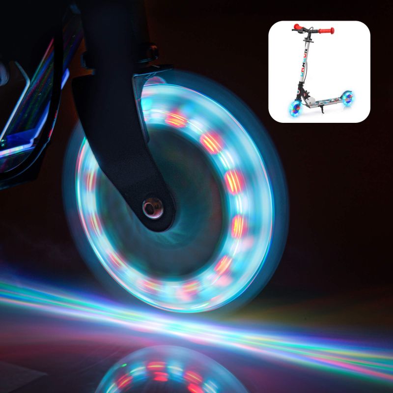 - Świecące kółka dodają atrakcyjności i zwiększają widoczność hulajnogi podczas jazdy o zmierzchu. Wykonane zostały z wytrzymałego materiału PU, co gwarantuje płynność jazdy i odporność na uszkodzenia.