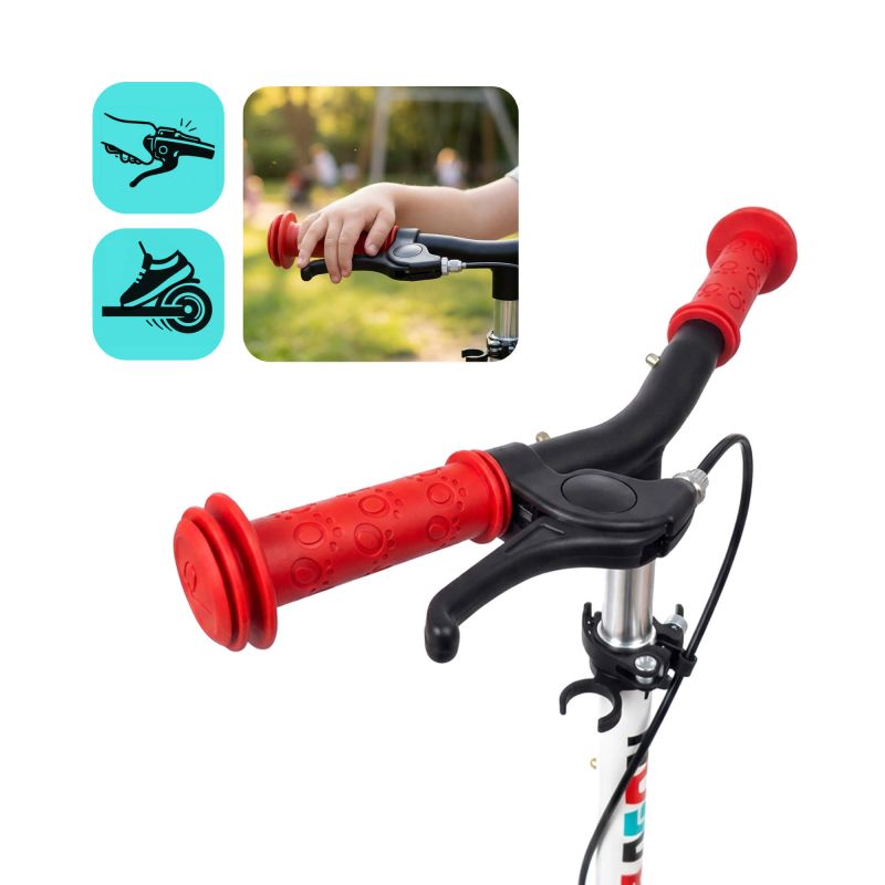 Bezpieczeństwo i kontrola - gumowe uchwyty kierownicy gwarantują pewny chwyt, a hamulec nożny na tylnym kole oraz ręczny na kierownicy zapewniają skuteczne hamowanie i pełną kontrolę nad hulajnogą, co jest kluczowe dla bezpieczeństwa Twojego dziecka.