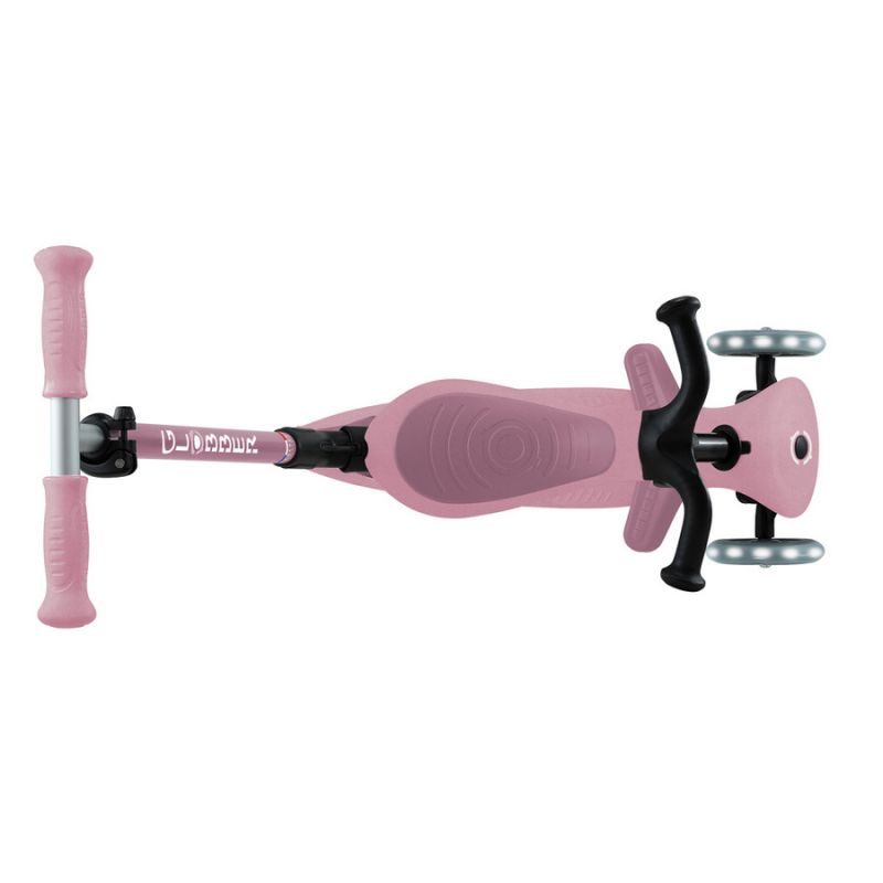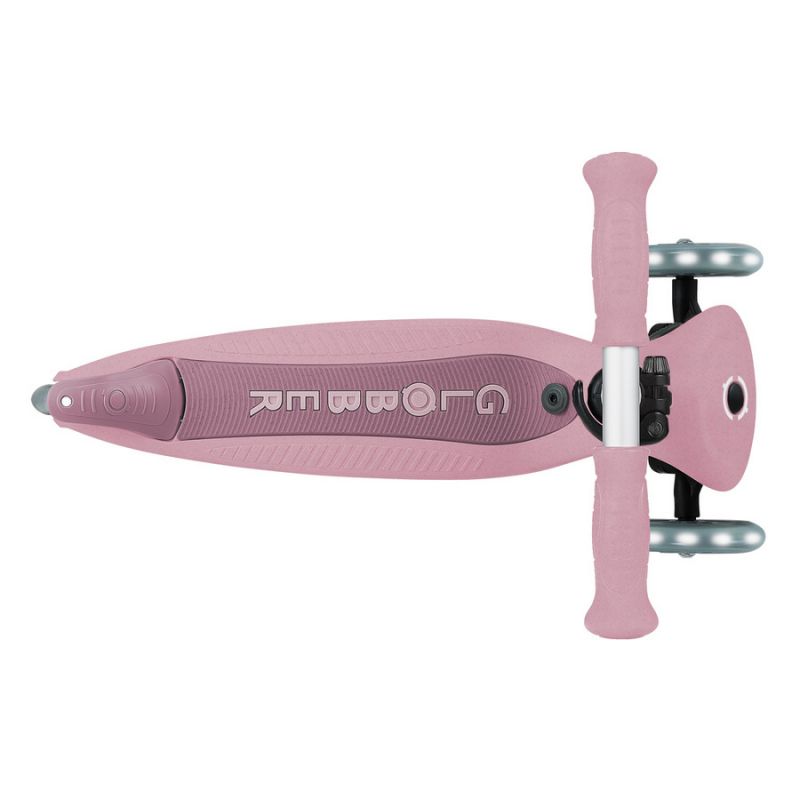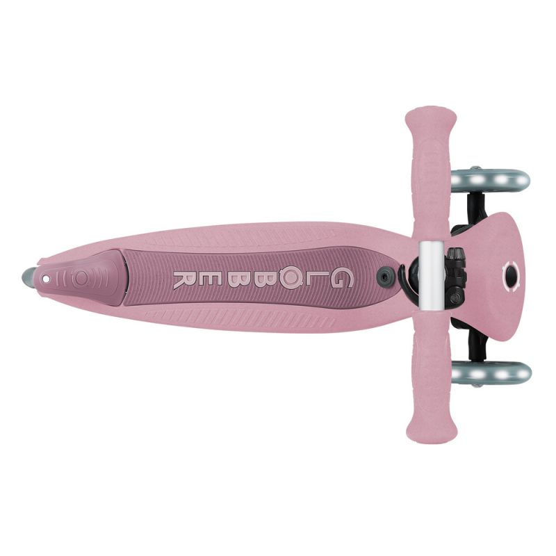 GO • UP Active Lights ECOLOGIC jest wyposażony w opatentowany przez firmę Globber system blokowania kierownicy, który blokuje przednie koła hulajnogi, aby poruszać się tylko do przodu i do tyłu, dzięki czemu dzieci zyskują pewność podczas jazdy na hulajnodze, jednocześnie ćwicząc umiejętności utrzymywania równowagi.