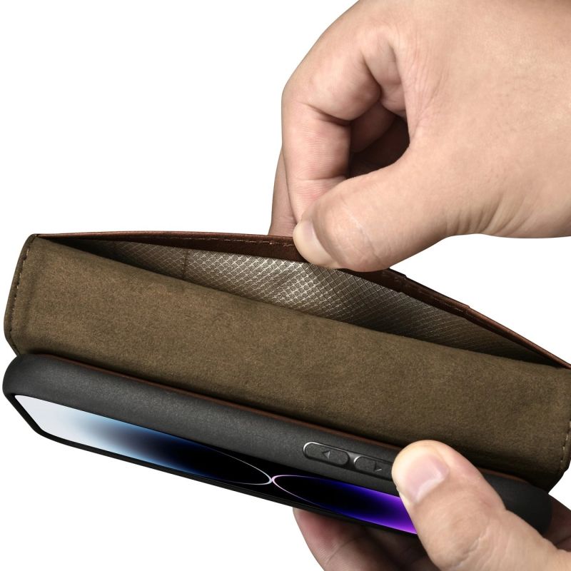 iCarer Oil Wax Wallet Case 2in1 etui iPhone 14 Pro skórzany pokrowiec z klapką Anti-RFID brązowy (WMI14220722-BN)