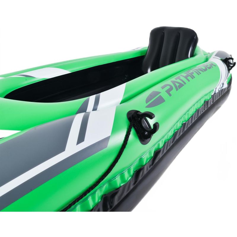 Zaletą tego nadmuchiwanego kajaka jest miękka podłoga, oparcie i burty oraz wiele innych udogodnień takich jak uchwyt na wiosła czy linki holownicze. W zestawie znajdziesz dodatkowo łatkę naprawczą, pompkę do nadmuchiwania oraz wiosło.