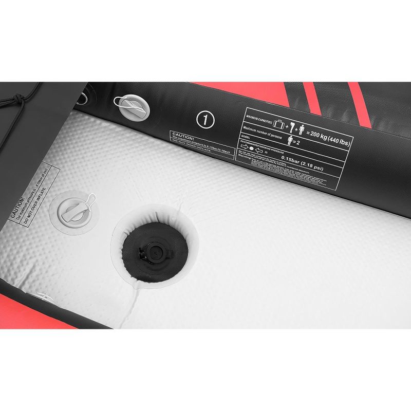 Zaletą tego nadmuchiwanego kajaka jest sztywna podłoga, wygodne siedziska oraz wiele innych udogodnień takich jak regulowana odległość podnóżków, uchwyt na wiosła, gumy na bagaż czy specjalne uchwyty do przenoszenia. W zestawie znajdziesz dodatkowo pokrowiec na kajak, zestaw naprawczy, pompkę do nadmuchiwania oraz wiosła.