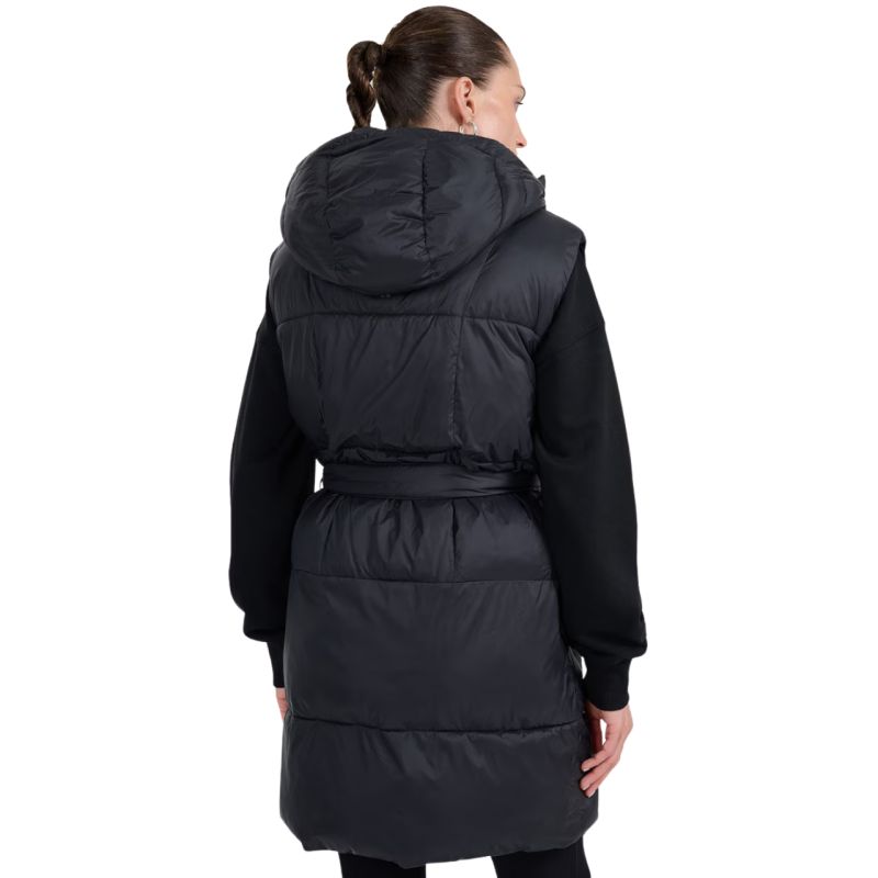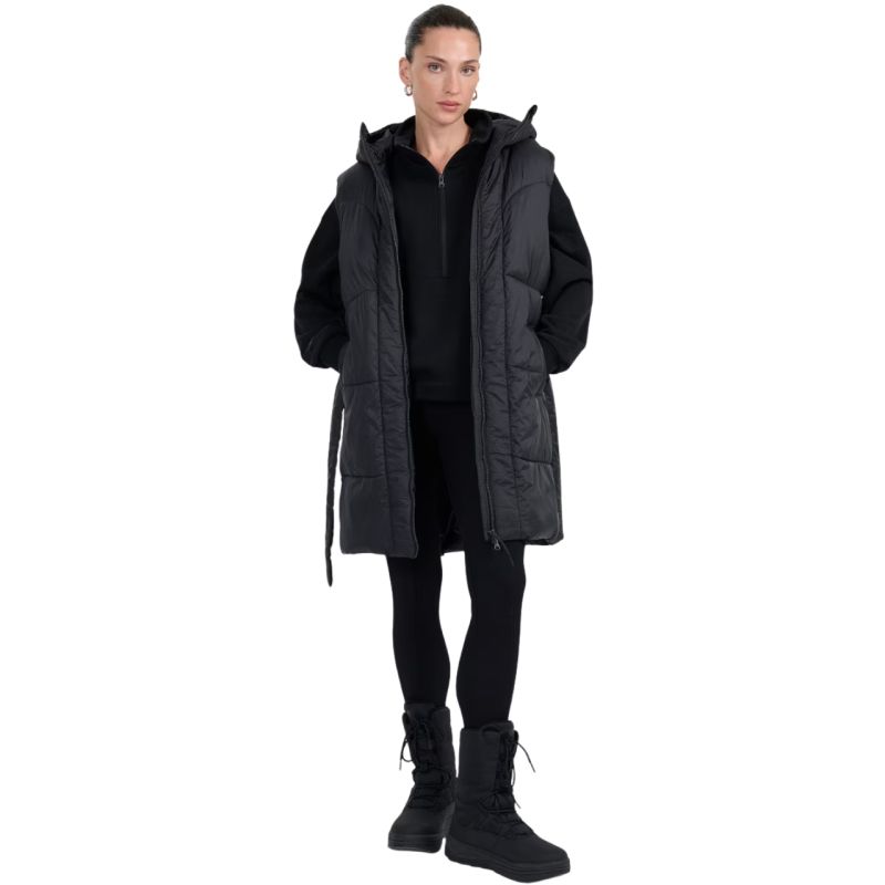 - Długa kamizelka z gładką podszewką i paskiem sprawdzi się w zróżnicowanych warunkach atmosferycznych, dbając o komfort cieplny i pełną swobodę ruchów.