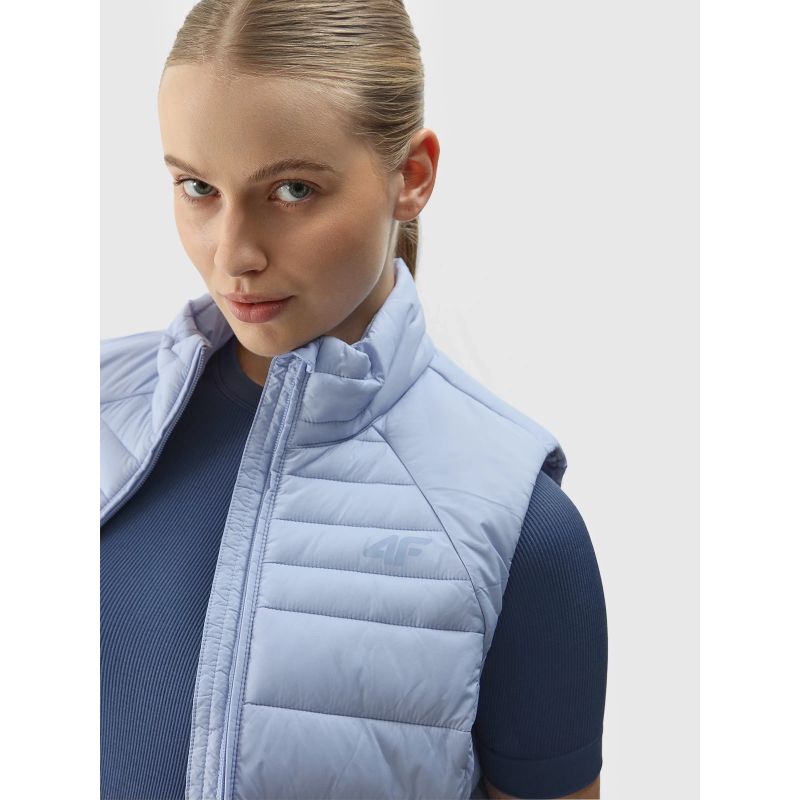 Damskibezrękawnik wypełniony puchem syntetycznym pochodzącym z recyklingu, ze stójką i lekką konstrukcją, dzięki czemu można go nosić zarówno podczas codziennych aktywności, jak i w cieplejsze dni w okresie przejściowym na aktywność fizyczną. Jej niewielka waga sprawia, że nie stanowi dodatkowego obciążenia podczas ćwiczeń, a jednocześnie stanowi skuteczną warstwę izolującą, zwłaszcza pod kurtki z membranami wodoodpornymi. Nie tylko chroni przed zimnem, ale także doskonale sprawdza się jako element warstwowych stylizacji. Łatwy w montażu i przechowywaniu. Ma dopasowany krój, który przylega do ciała i ma regularną długość w biodrach.