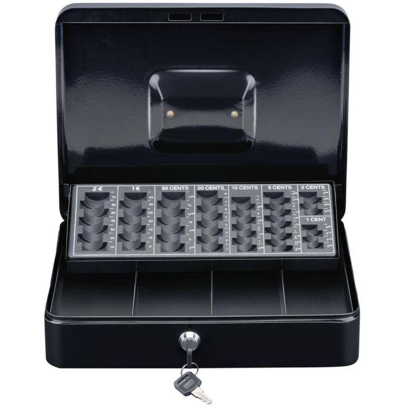 Wyposażona w solidny zamek, który chroni zawartość przed niepowołanym dostępem. Do kasetki dołączono dwa klucze.