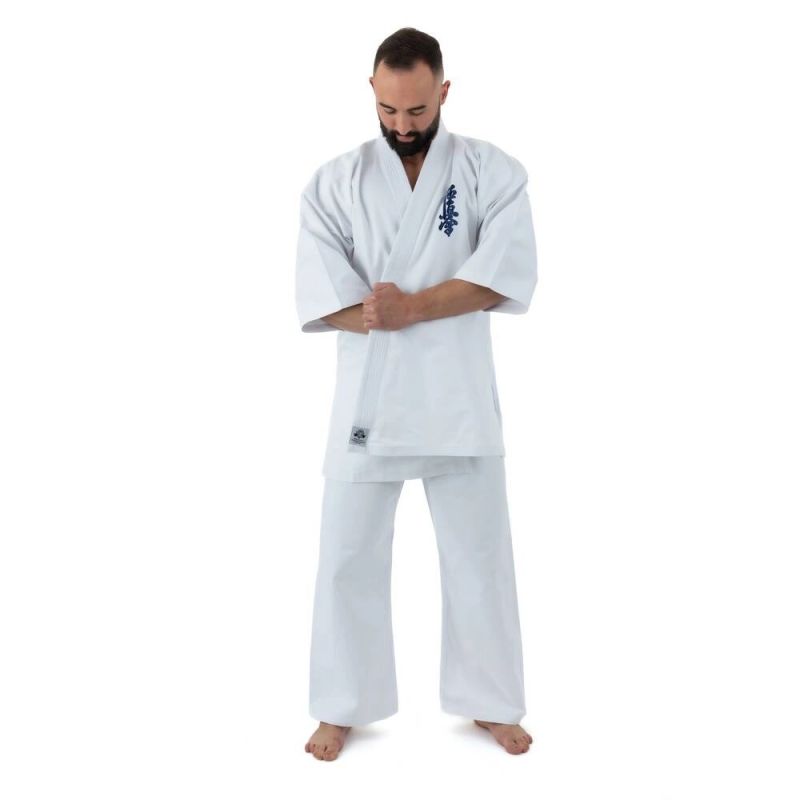 Bluzka kimona posiada szerokie opadające rękawy o długości ¾ oraz granatowy haft Kyokushin lewej piersi nadając jej charakterystyczny wygląd.