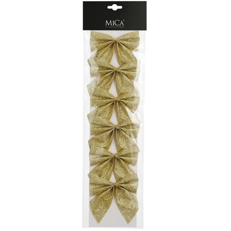 Dodaj blasku swoim Świętom! ??? Kokarda dekoracyjna złota 10x12 cm MICA (6 sztuk) to szybki sposób na eleganckie i spójne aranżacje choinki, prezentów i wnętrz.