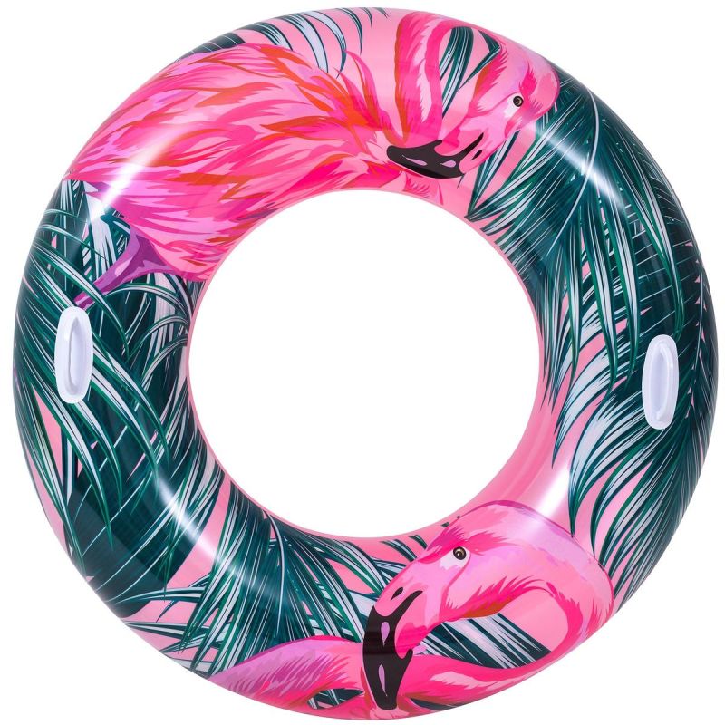 Ten produkt od Sun Club świetnie sprawdzi się na plaży czy w przydomowym basenie, zapewniając wysoki komfort wypoczynku podczas letniego urlopu. Wykonany z grubego i mocnego 0,22 mm winylu zapewni wytrzymałość i co najważniejsze, odporność na promieniowanie UV i chemię basenową. To duże i oryginalne nadmuchane koło do pływania o średnicy zewnętrznej ok.: 100 cm zrobi wrażenie na każdym wczasowiczu! Dwa uchwyty ułatwiają przenoszenia i wyjmowanie z wody oraz utrzymanie równowagi podczas pływania w wodzie.