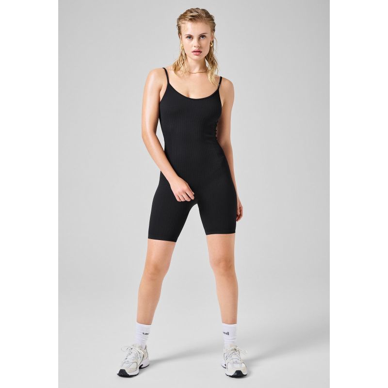 Dopasowane body wykonane z bezszwowej dzianiny ściągaczowej, zapewni idealne dopasowanie i komfort podczas wszelkiego rodzaju ćwiczeń. Wykonane ze strukturalnego, ale elastycznego poliamidu pochodzącego z recyklingu, posiada dopasowany krój, z dekoltem w kształcie litery V, cienkimi ramiączkami i długością do połowy uda. Stworzony na siłownię, do studia i nie tylko.