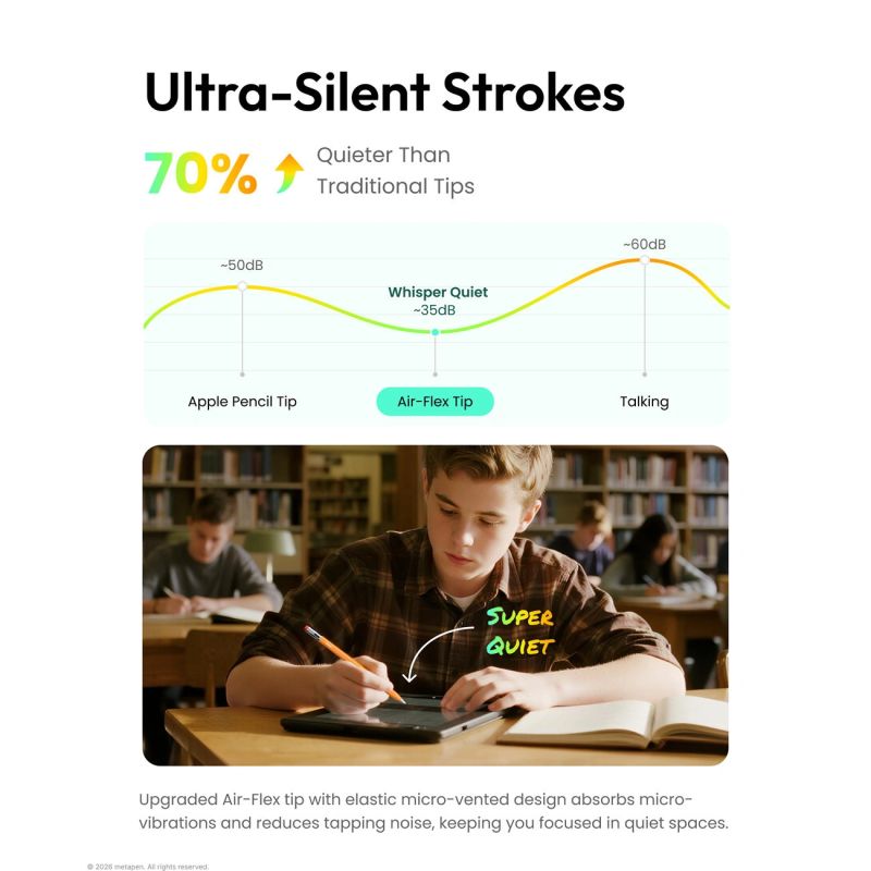 Końcówki Metapen Air-Flex redukują dźwięk tarcia nawet o około 70% w porównaniu do tradycyjnych końcówek. Brak charakterystycznego stukania pozwala komfortowo pracować w bibliotece, biurze czy podczas zajęć bez rozpraszania otoczenia.
