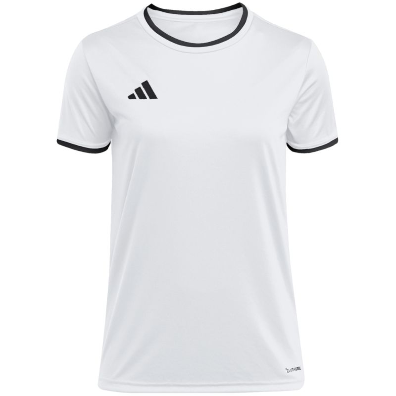 Koszulka damska adidas Entrada 26 Jersey biała JZ2497 Koszulka piłkarska adidas zgodnie z założeniami projektowymi pozwoli każdej, regularnie trenującej kobiecie podnieść wydajność przy zachowaniu maksymalnego komfortu na każdym etapie aktywności. Kolorystyka daje wszechstronne możliwości kompletowania sportowych zestawień. Okrągły dekolt i wyszywane logo są spójnym dopełnieniem piłkarskiego fasonu o ponadczasowym charakterze. Koszulkę uszyto z szybkoschnących, poliestrowych włókien wspartych technologią Climacool, która skutecznie odprowadza i rozprasza pot, zapewniając przewiewność, suchość i pełną koncentrację podczas intensywnego wysiłku fizycznego. Dopasowany krój swobodnie otula sylwetkę zapewniając pełną mobilność w trakcie ruchu, dlatego będziesz czuła się pewnie i wygodnie na sesji treningowej i meczu. Poliestrowe włókna wykorzystane w produkcji tego modelu, powstały w procesie recyklingu, co przyczynia się do ochrony naturalnych zasobów środowiska. Z koszulką adidas pochodzącą z zaprogramowanej na sukces linii Entrada sprawi, że osiągniesz większy progres i dasz z siebie więcej w trakcie rozgrywek. Materiał: 100% poliester z recyklingu