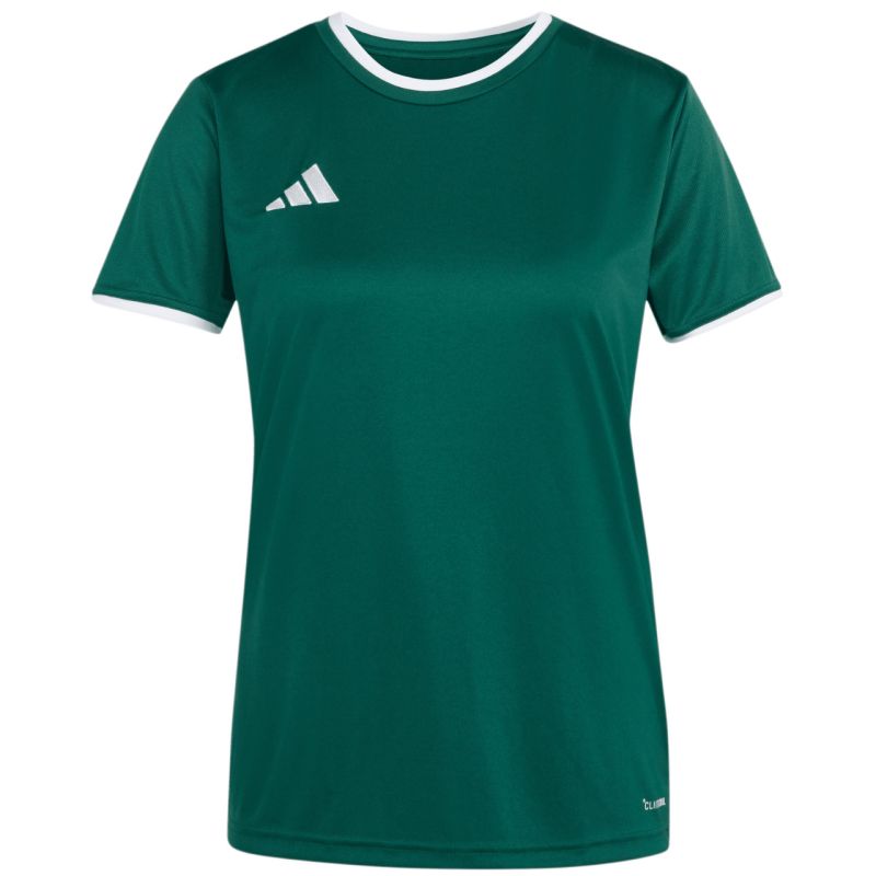 Koszulka damska adidas Entrada 26 Jersey zielona KE9833 Koszulka damska adidas sprawdzi się podczas treningów i decydujących rozgrywek meczowych. Model z linii Entrada. Okrągły dekolt. Wyszywane logo. Koszulkę uszyto z szybkoschnących, poliestrowych włókien wspartych technologią Climacool, która skutecznie odprowadza i rozprasza pot. Dopasowany krój. Poliestrowa tkanina wykorzystana w produkcji tego modelu, powstała w procesie recyklingu, co przyczynia się do ochrony naturalnych zasobów środowiska. Materiał: 100% poliester z recyklingu