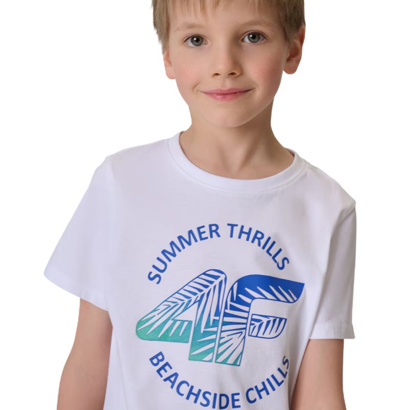 Koszulka dla chłopca 4F M3284 biała 4FJWSS26TTSHM3284 10S Koszulka dla chłopca 4F sprawdzi się na co dzień. Luźny krój. Miękki materiał. Nadruk z przodu. Materiał: 100% bawełna