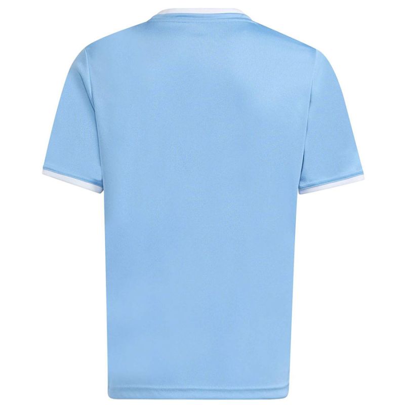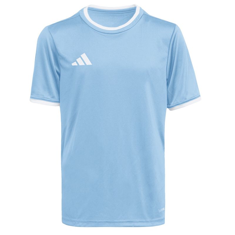 Koszulka dla dzieci adidas Entrada 26 Jersey błękitna JZ2527 Koszulka dla dzieci adidas powinna znaleźć się w sportowej garderobie każdego młodego piłkarza, który chce w pełnym skupieniu doskonalić swoje umiejętności. Lekka konstrukcja z poliestru zyskała wsparcie w technologii Climacool, która pomaga odprowadzać pot z powierzchni skóry, oferując uczucie świeżości, suchości i ochłody. Klasyczny krój nie krepuje ruchów. Estetyczne wykończenie w postaci okrągłego dekoltu i wyszywanego logo. Materiał: 100% poliester pochodzący z recyklingu