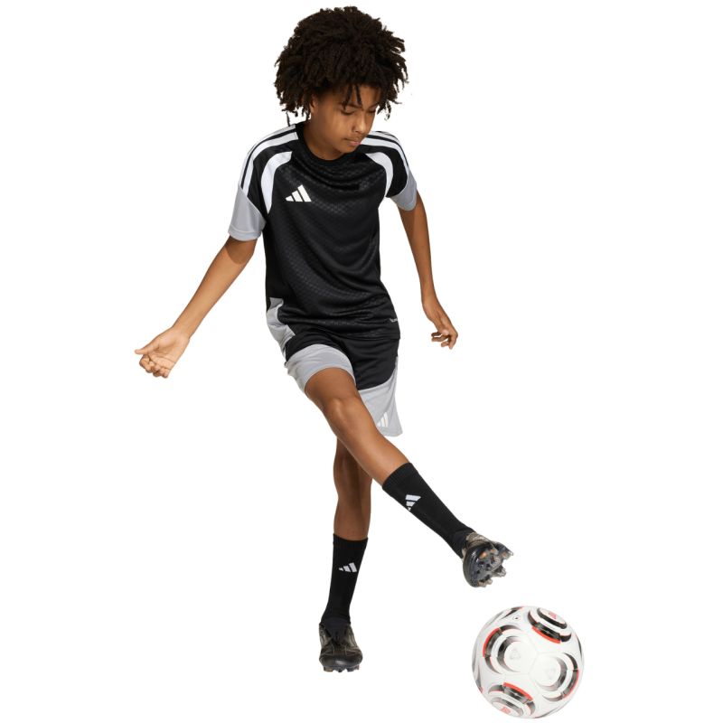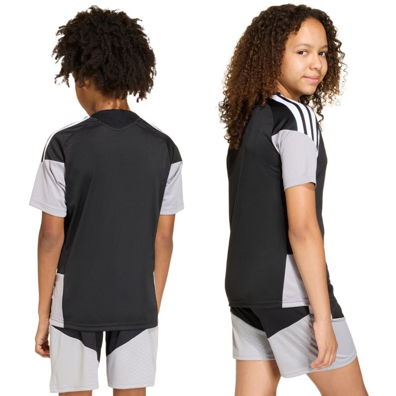 Koszulka dla dzieci adidas Tiro 26 Competition Training czarno-szara KA7599 Koszulka dla dzieci adidas sprawdzi się podczas treningów i decydujących rozgrywek. Regularny krój. Wstawki z siateczki na klatce piersiowej. Technologia Climacool pochłania i odprowadza pot. Włókna powstały w procesie recyklingu. Subtelne logo. Paski na rękawach. Materiał: 100% poliester z recyklingu