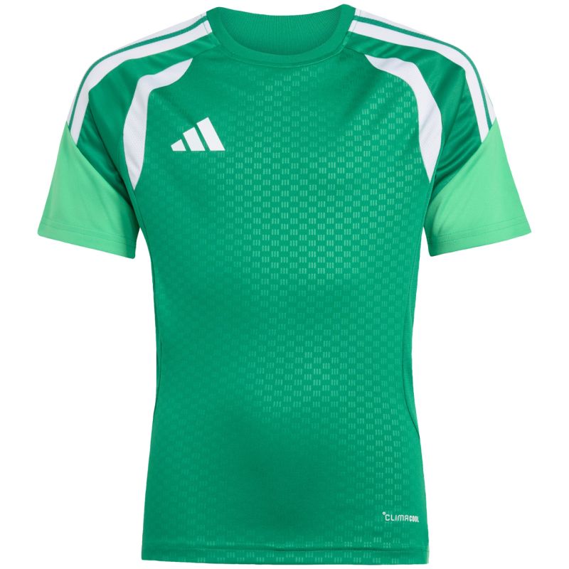 Koszulka dla dzieci adidas Tiro 26 Competition Training Jersey zielona KA7606 Koszulka dla dzieci adidas sprawdzi się podczas treningów i decydujących rozgrywek. Regularny krój. Wstawki z siateczki na klatce piersiowej. Technologia Climacool pochłania i odprowadza pot. Włókna powstały w procesie recyklingu. Subtelne logo. Paski na rękawach. Materiał: 100% poliester z recyklingu