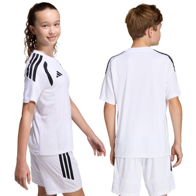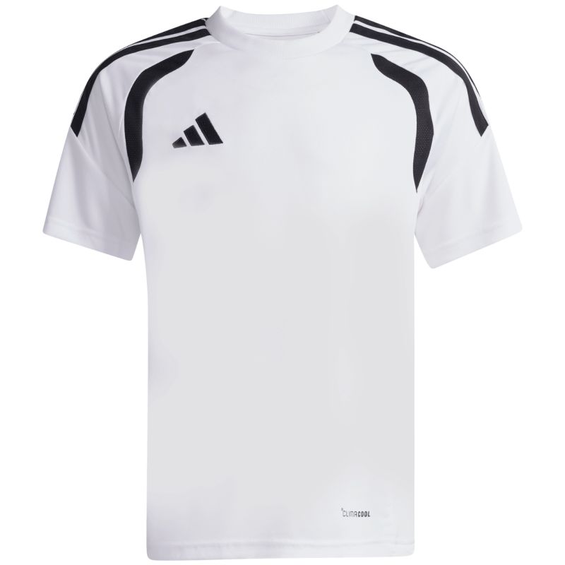 Koszulka dla dzieci adidas Tiro 26 League Jersey biała KB1312 Koszulka dla dzieci adidas sprawdzi się podczas rozgrywek piłkarskich. Regularny krój. Okrągły dekolt. Panele z siateczki. Technologia Climacool. Włókna powstały w procesie recyklingu. Materiał: 100% poliester z recyklingu