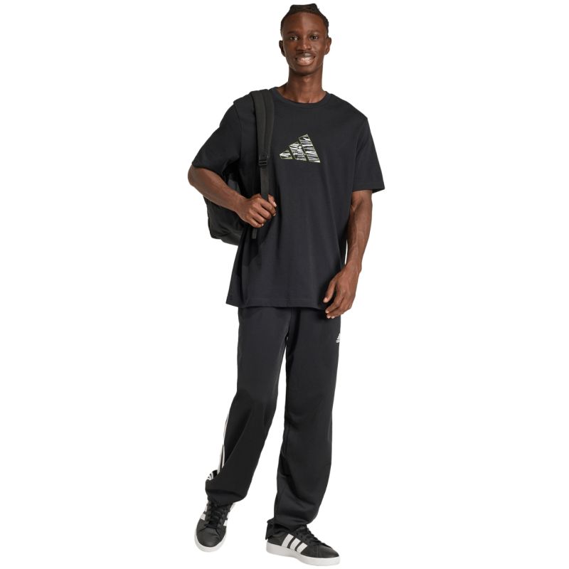 Koszulka męska adidas Camo Explorer Graphic czarna JZ7500 Męska koszulka adidas prezentuje niebanalny design, który obowiązkowo powinien znaleźć się w szafie każdego miłośnika nowoczesnych rozwiązań. Model zyskał miękką, bawełnianą konstrukcję, która wentyluje ciało i nie powoduje podrażnień na skórze. Klasyczny krój nie pozbawia pełnego zakresu ruchów. Duże logo z grafiką moro na przodzie. Materiał: 100% bawełna