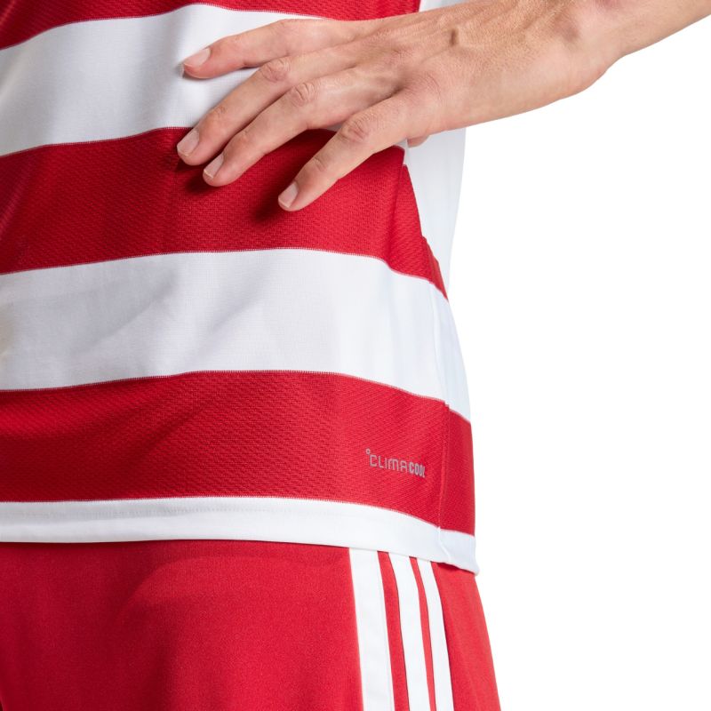 Koszulka męska adidas Hooped 26 Jersey biało-czerwona KF3388 Koszulka męska adidas sprawdzi się podczas rozgrywek meczowych. Design w paski. Uszyta z szybkoschnących, poliestrowych włókien. Technologia Climacool. Dopasowany krój. Materiał: 100% poliester z recyklingu
