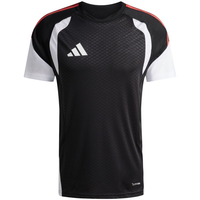 Koszulka męska adidas Tiro 26 Competition Training Jersey czarna KA7582 Koszulka dla mężczyzn adidas sprawdzi się podczas treningów i meczów. Dopasowany krój. Okrągły dekolt. Technologia Cllimacool odprowadza i rozprasza pot, zapewniając przewiewność, suchość. Włókna powstały w procesie recyklingu. Tłoczny wzór na przednim panelu. Materiał: 100% poliester z recyklingu