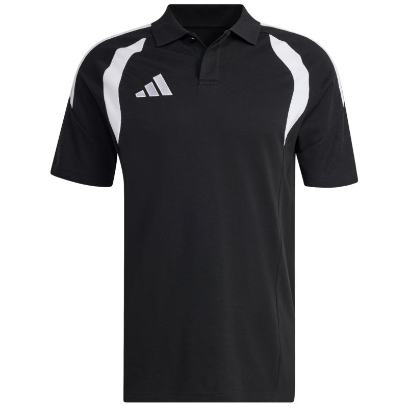 Koszulka męska adidas Tiro 26 League Polo czarna KF3397 Męska koszulka adidas sprawdzi się gdy odpoczywasz poza linią boczną boiska lub wyjeżdżasz z drużyną na kolejny mecz. Miękki materiał łączący bawełnę oraz poliestrowe włókna. Paski na ramionach. Wstawki na klatce piersiowej. Wyszywane logo na piersi. Model pochodzący z linii Tiro. Kołnierzyk i listwa z guzikami. Standardowy krój. Materiał: 70% bawełna, 30% poliester