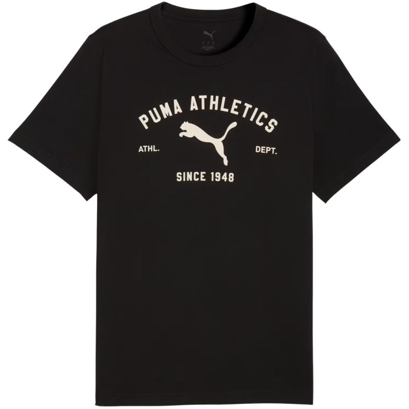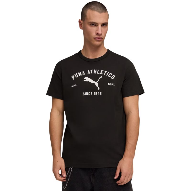 Koszulka męska Puma Class Graphic Tee czarna 692226 01 Koszulka męska Puma sprawdzi się na co dzień. Napisy na forcie. Duże logo z przodu. Krótkie rękawy. Miękki materiał. Materiał główny: 100% bawełna