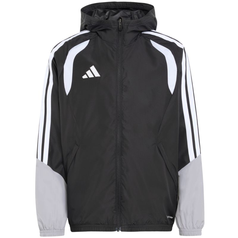 Kurtka dla dzieci adidas Tiro 26 Competition All Weather czarna KB0156 Kurtka dla dzieci adidas Tiro sprawdzi się podczas treningów. Zamek na całej długości pozwala na szybkie ubieranie. Patka chroniąca podbródek. Kaptur bez regulacji. Hydrofobowe właściwości. Wiatroszczelna. Dane techniczne:· Materiał: 100% poliester (pochodzący z recyklingu)· Standardowy krój· Suwak na całej długości· Technologia CLIMA365 · Przednie kieszenie na suwaki· Kaptur· Elastyczne mankiety i dół