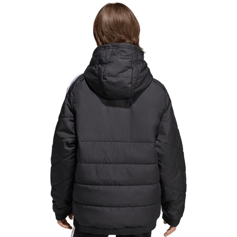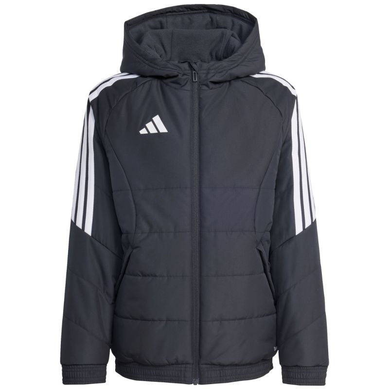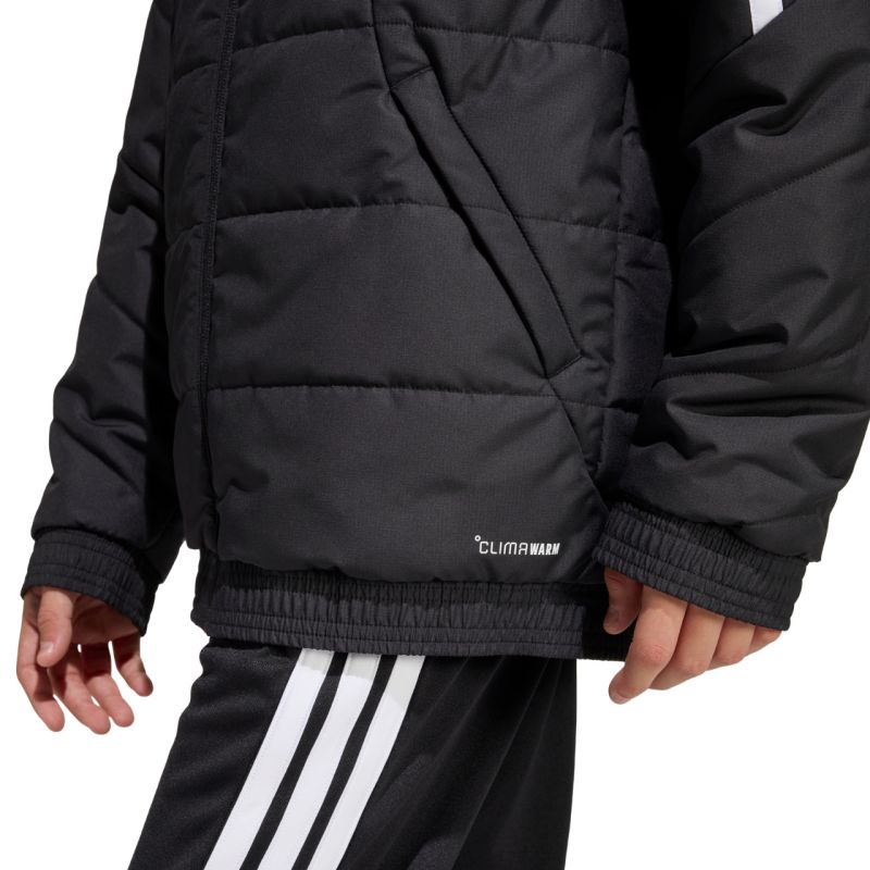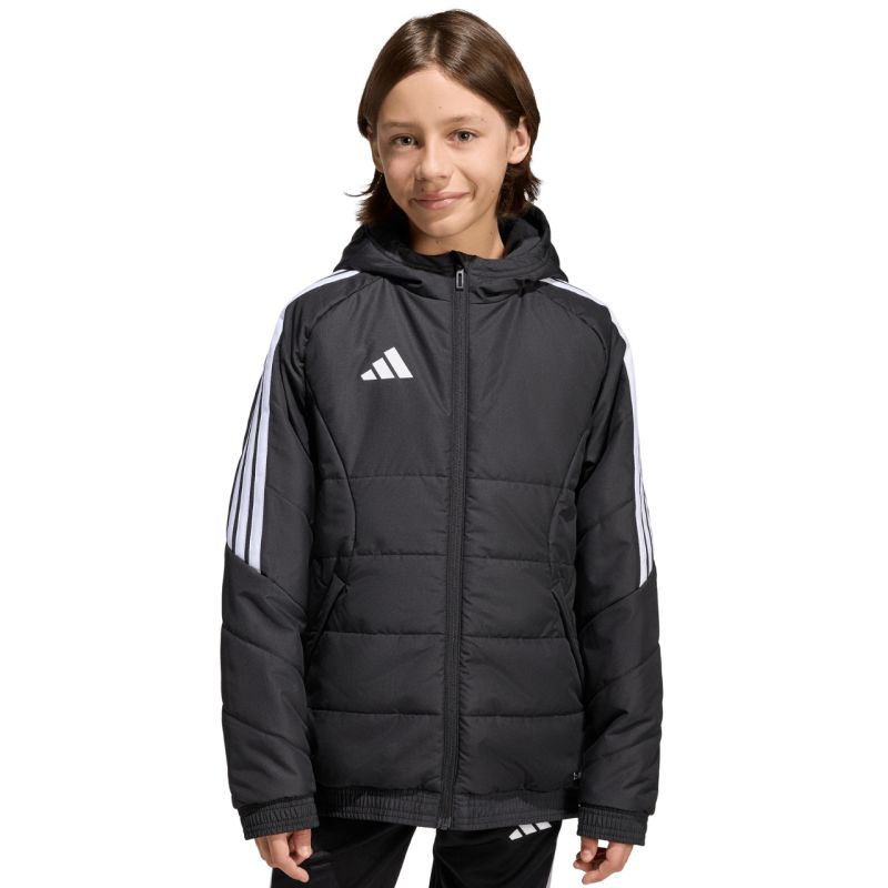 Kurtka dla dzieci adidas Tiro 26 Winter czarna KA5319 Kurtka dla dzieci adidas z piłkarskiej linii Tiro sprawdzi się również na co dzień. Syntetyczne wypełnienie równomiernie rozłożone w poziomych, szerokich panelach pomaga w utrzymaniu optymalnej temperatury ciała. Tradycyjny krój. Zamek na całej długości. Zapinane kieszenie boczne. Elastyczne wykończenie mankietów i dołu. Nieodpinany kaptur bez regulacji osadzony na wysokiej stójce. Paski na rękawach. Subtelne logo z przodu. Technologia Climawarm. Hydrofobowe właściwości warstwy zewnętrznej. Wiatroodporność tkaniny. Materiał wierzchni: 100% poliester z recyklinguWypełnienie: 100% poliester z recyklingu