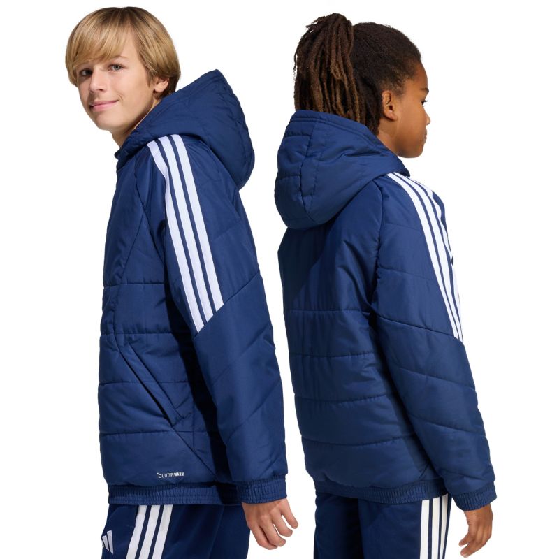 Kurtka dla dzieci adidas Tiro 26 Winter granatowa KA8026 Kurtka dla dzieci adidas z piłkarskiej linii Tiro sprawdzi się również na co dzień. Syntetyczne wypełnienie równomiernie rozłożone w poziomych, szerokich panelach pomaga w utrzymaniu optymalnej temperatury ciała. Tradycyjny krój. Zamek na całej długości. Zapinane kieszenie boczne. Elastyczne wykończenie mankietów i dołu. Nieodpinany kaptur bez regulacji osadzony na wysokiej stójce. Paski na rękawach. Subtelne logo z przodu. Technologia Climawarm. Hydrofobowe właściwości warstwy zewnętrznej. Wiatroodporność tkaniny. Materiał wierzchni: 100% poliester z recyklinguWypełnienie: 100% poliester z recyklingu