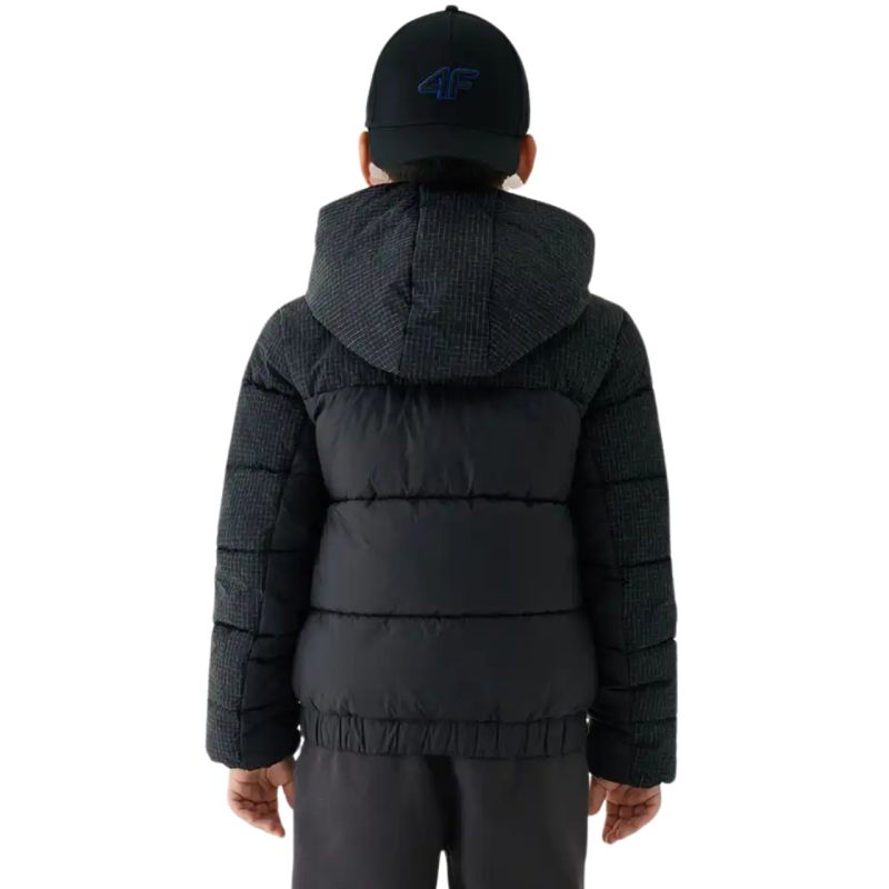 Kurtka puchowa dla chłopca 4F M621 głęboka czerń 4FJWAW25TDJAM621 20S Kurtka 4F dla chłopca sprawdzi się w chłodne dni w okresie jesienno-zimowym. Syntetyczny puch zamknięty w poziomych, szerokich panelach w połączeniu z technologią 4FWarm gwarantuje ochronę przed zimnem, oddychalność. Hydrofobowa impregnacja materiału. Strefowe wzmocnienia z tkaniny rip-stop. Regularny fason. Dół z elastyczną gumką. Nieodpinany kaptur zintegrowany z wysokim kołnierzem. Długi zamek daje możliwość indywidualnej termoregulacji. Dwie kieszenie boczne tworzą dodatkowa przestrzeń dla drobiazgów. Dane techniczne:· Materiał główny: 100% poliamid· Materiał główny 2: 93% poliamid, 7% poliester· Podszewka: 100% poliester· Wypełnienie: 100% poliester (puch syntetyczny)